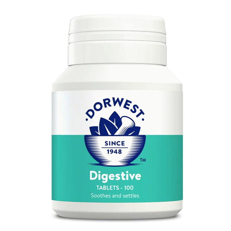 Dorwest Digestive is een 100% natuurlijk supplement met kruiden zoals gember, venkel en rabarber, die worden gebruikt ter ondersteuning van een normale spijsvertering voor honden en katten.