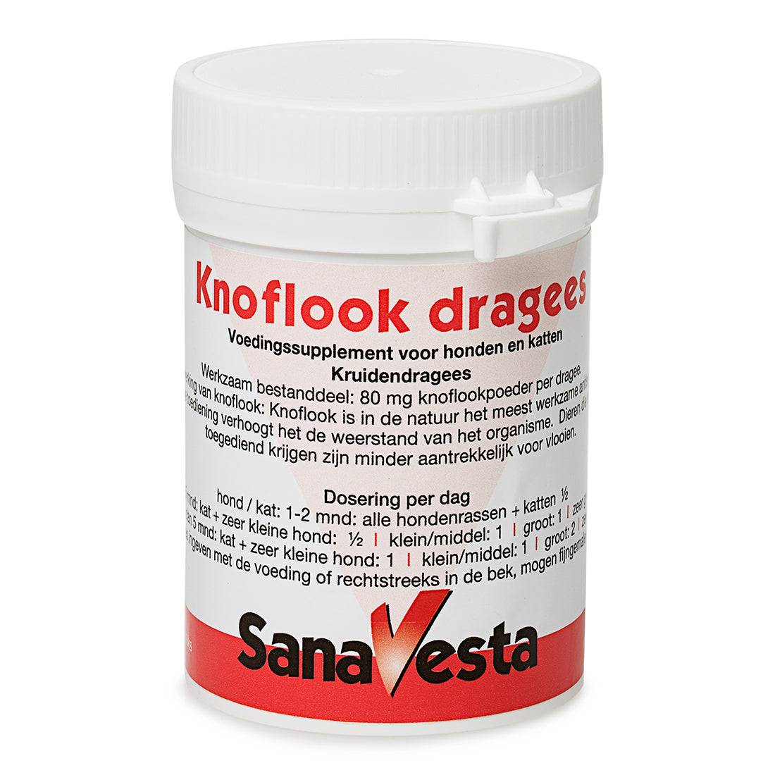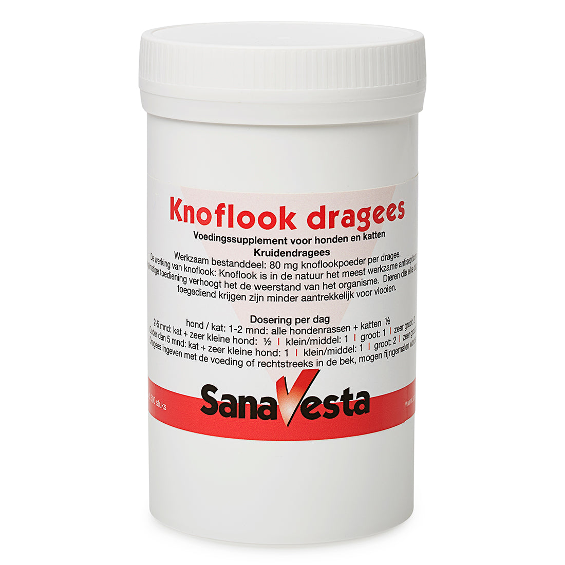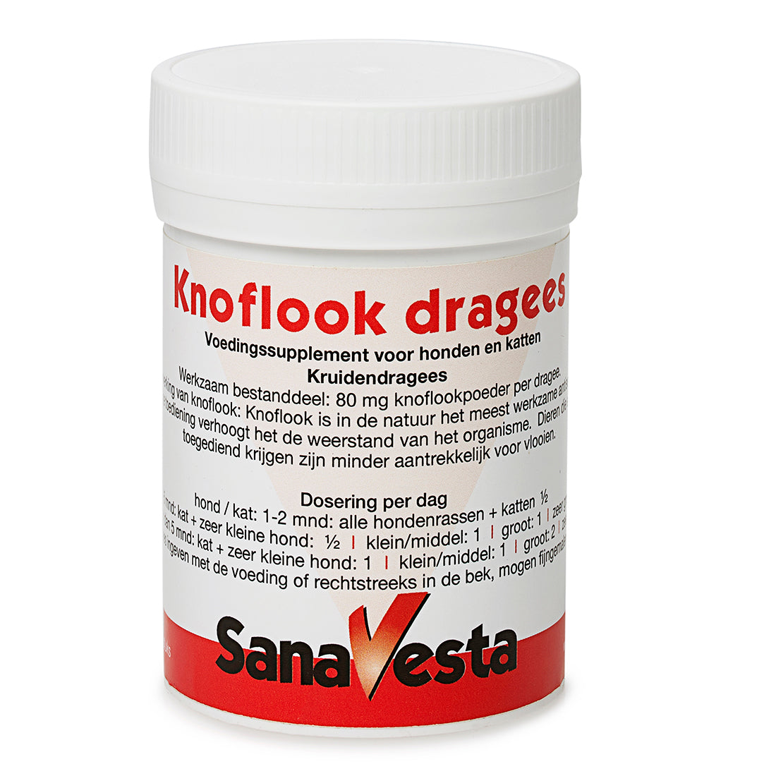 Knoflook bevat van nature thiosulfaten die bij hoge doseringen schadelijk kunnen zijn voor honden en katten. De Sana-Vesta Knoflookdragees bevatten 80 mg knoflookpoeder per dragee — een zorgvuldig gedoseerde hoeveelheid die bij dagelijks gebruik binnen de aanbevolen dosering veilig is. Geef uw hond of kat nooit verse knoflook als vervanging — de hoeveelheid werkzame stoffen daarin is niet gecontroleerd. Overschrijd de aanbevolen dagdosering niet en raadpleeg bij twijfel een dierenarts.